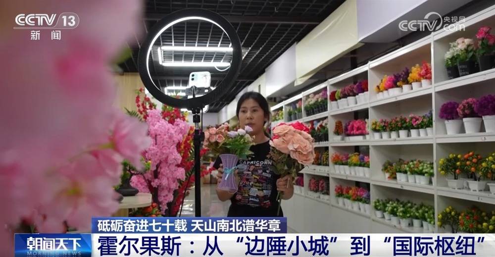 r在霍尔果斯的一家商贸城里,英语、俄语、哈萨克语的播报声此起彼伏,一层楼里竟有20多间商铺正在进行跨境直播,面向欧洲和中亚推介中国好货。